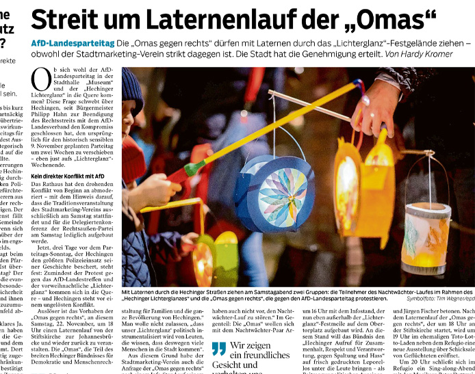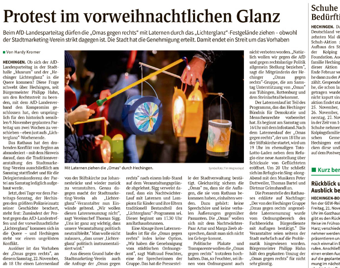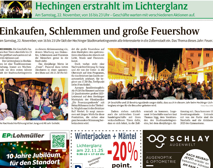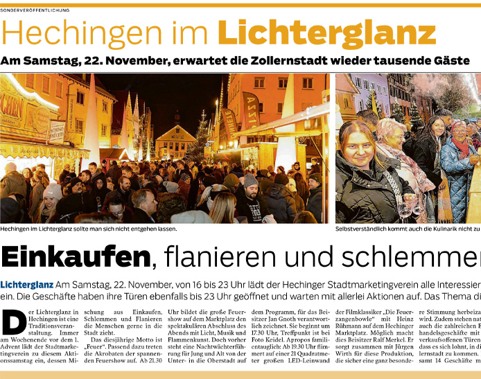 Der Lichterganz ist eine der ältesten und traditionsreichsten Veranstaltungen des Hechinger Stadtmarketingvereins. Wenn die Nächte vor dem 1. Advent lang und dunkel sind, bringen wir an diesem Abend Licht und Stimmung in die festlich geschmückte Stadt: Hunderte von atmosphärischen Lichtinstallationen, bunte Lichterketten, musikalische Einlagen und Feines für Leib und Magen stimmen auf die Vorweihnachtszeit ein. Und wer schon die ersten Geschenke besorgen möchte, kann dies bei unseren Mitgliedsbetrieben tun, die bis 22 Uhr für Sie geöffnet haben.